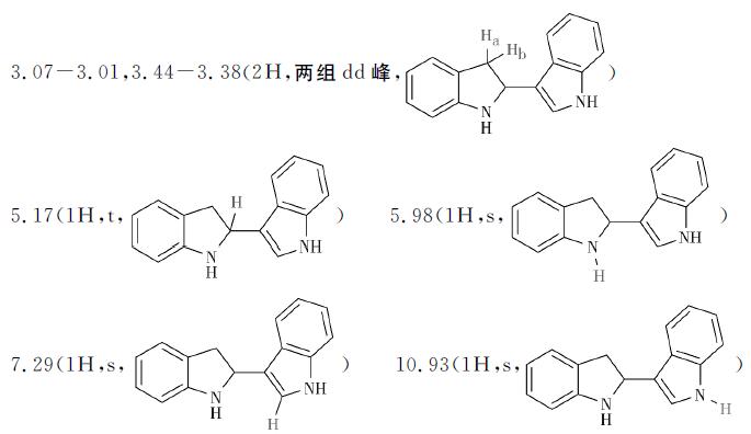 產物3b(5-bromo-3-(5-bromoindolin-2-yl)- 1H-indole)1 H NMR (400 MHz,DMSO-d6)δppm:11.15 (s,1H),7.68(s,1H),7.36-7.34(m,2H),7.21-7.17(m,2H),7.09(d,J=8.0Hz,1H),6.49 (d,J=8.0Hz,1H),6.20(s,1H),5.14(t,J=8.0Hz,1H),3.41-3.36(dd,J=8.0Hz,1H),3.01 -2.95(dd,J=8.0Hz,1H);13C NMR(100MHz,DMSO-d6)δppm:151.28,135.48,131.11,129.60, 127.38,126.92,123.86,123.63,121.52,117.59,113.62,111.12,109.52,107.27,55.77,37.04